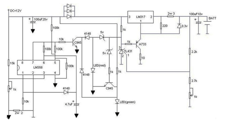 本電路帶充電狀態顯示功能,紅燈閃正在充,綠燈閃馬上要充滿,綠燈亮完全充滿。只要您有12V的電源就可以,接完電路后先別裝電池,調右下角的可調電阻,使電池輸出端為4.2V,再調左下角的可調電阻使LM358第三腳為0.16V就可以了,充電電流為380mA,超快,三個并連的二極管是降壓的,防止LM317過熱,且LM317須加散熱片,圖中的三極管可以任意型號。