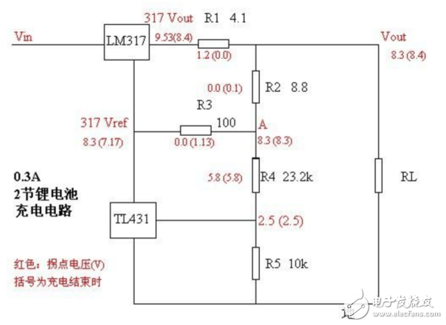由LM317和R1、R2、R3組成一個典型的恒流電路(431暫時認為斷開R4比較大可以先不看)。當電壓不太高時保持恒定的充電電流。以兩節電池充電為例,理想狀態下,充電電流應該是電壓達到8.3V前一直保持恒定。當A點電壓達到拐點值8.3V時,經過R4、R5分壓,TL431開始導通,并把LM317的基準點電壓從8.3V逐漸拉下。所謂拐點就是指電流開始下降的那點。直到電壓達到8.4V的0電流點,A點仍然保持這個8.3V電壓,LM317的輸出Vout下降到8.4V,其調整端下降到7.17V。
