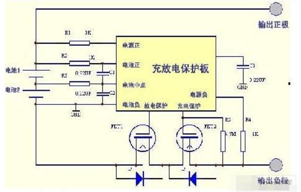由兩個場效應(yīng)管和專用保護(hù)集成塊S--8232組成,過充電控制管FET2和過放電控制管FET1串聯(lián)于電路,由保護(hù)IC監(jiān)視電池電壓并進(jìn)行控制,當(dāng)電池電壓上升至4.2V時,過充電保護(hù)管FET1截止,停止充電。為防止誤動作,一般在外電路加有延時電容。當(dāng)電池處于放電狀態(tài)下,電池電壓降至2.55V時,過放電控制管FET1截止,停止向負(fù)載供電。過電流保護(hù)是在當(dāng)負(fù)載上有較大電流流過時,控制FET1使其截止,停止向負(fù)載放電,目的是為了保護(hù)電池和場效應(yīng)管。