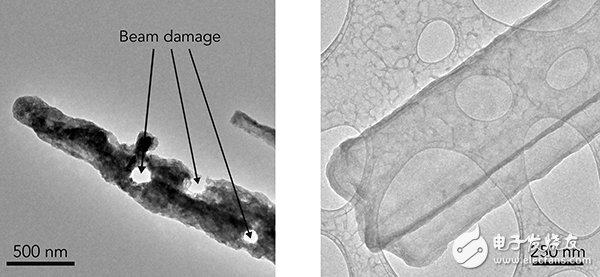 左圖:在室溫下的TEM圖像中,鋰的枝晶因暴露在空氣中而被腐蝕,電子束也在上面熔出大量孔洞;右圖:cryo-EM下的圖像,冷凍環境保存了其原來的狀態,表明其有明確界面的晶體納米線。