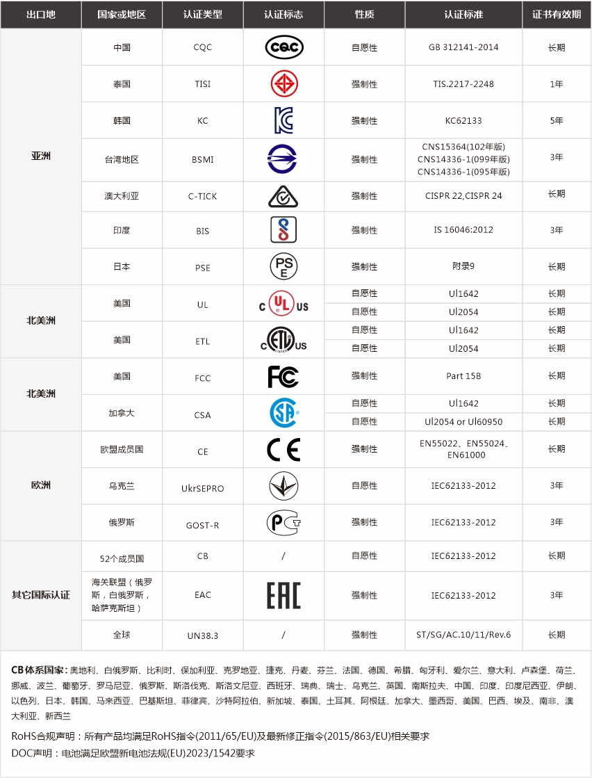 全球主要國家和地區認證明細(電池產品類)